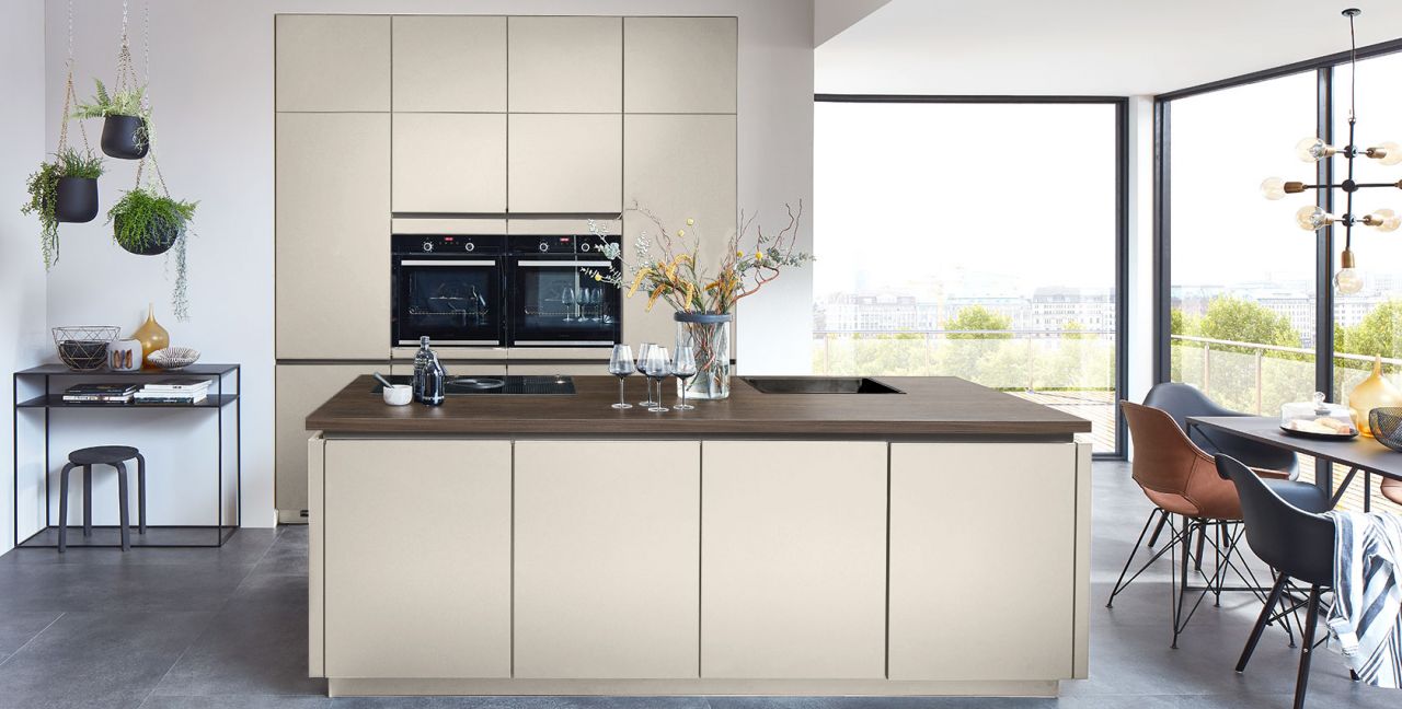 Designkeuken Nobilia Easytouch LineN ca. 240 / 250 x 110 cm, front: laklaminaat, zand ultramat, werkblad: decor noten Milano
