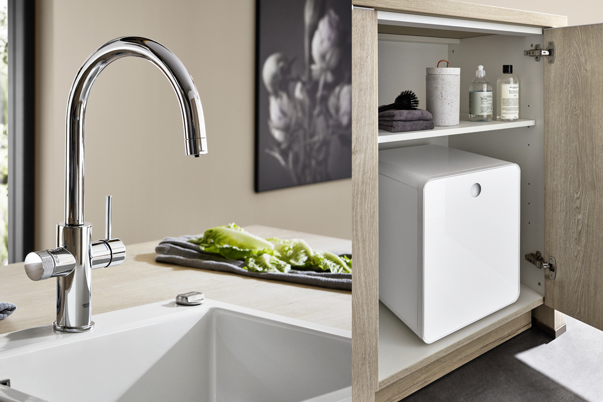 Het GROHE Blue Red in one-systeem verrast door zijn innovatieve veelzijdigheid gekoeld, plat of bruisend en zelfs kokend water, het komt allemaal uit dezelfde kraan.