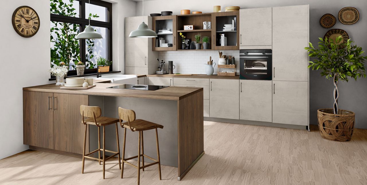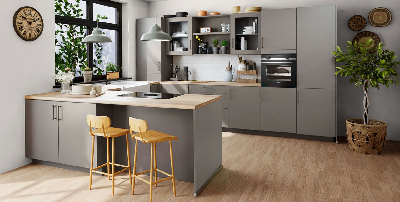 Keuken in U-vorm Nobilia Laser ca. 245 x 305 x 387 cm, front: taupe grijs, werkblad: Decor eiken Montreal