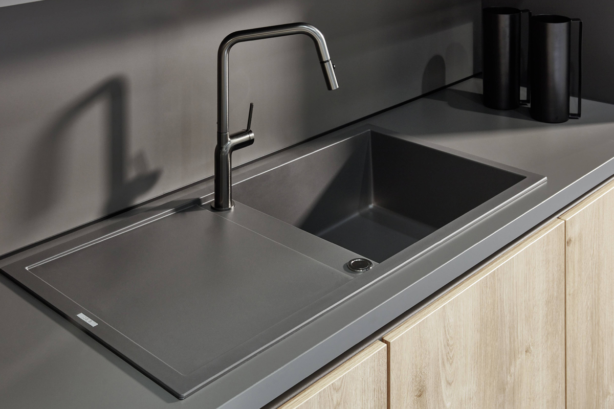 Inclusief oven in zwart / RVS Siemens HB517GBS3 Energieklasse A+, keramische kookplaat met inductie en werkbladafzuiging (circulatielucht) Bora GP4U, koelkast Progress PK0814 Energieklasse E, volledig geïntegreerde vaatwasmachine Junker JS55X02ITE Energieklasse E, inbouw-designspoelbak Schock Kallio M175, XL-kasten, onderkast met uittrekinterieur, wand-schappenkast, eetbar.