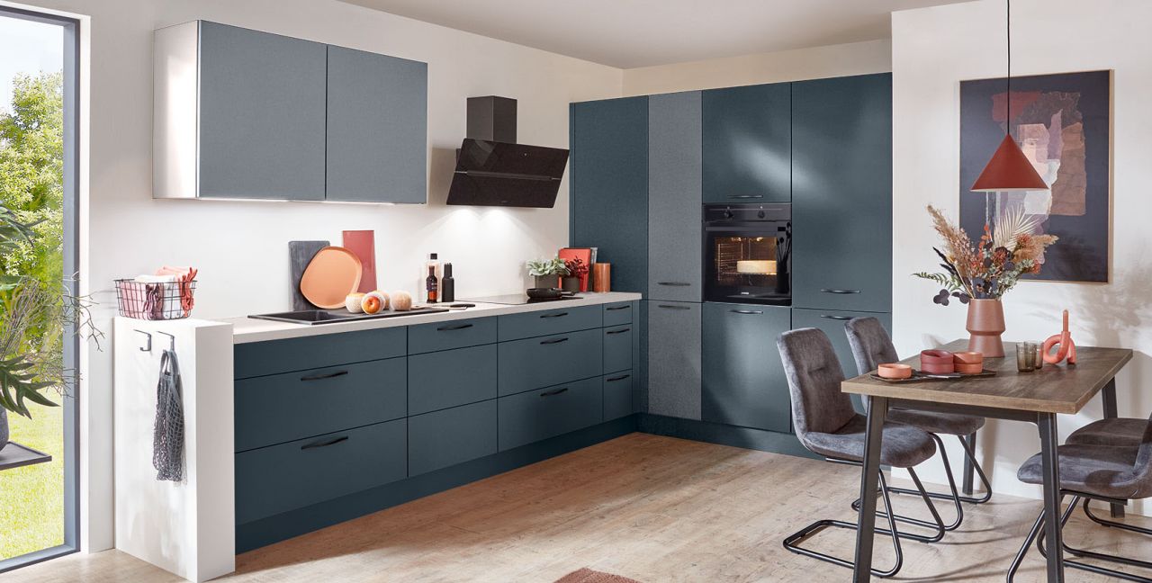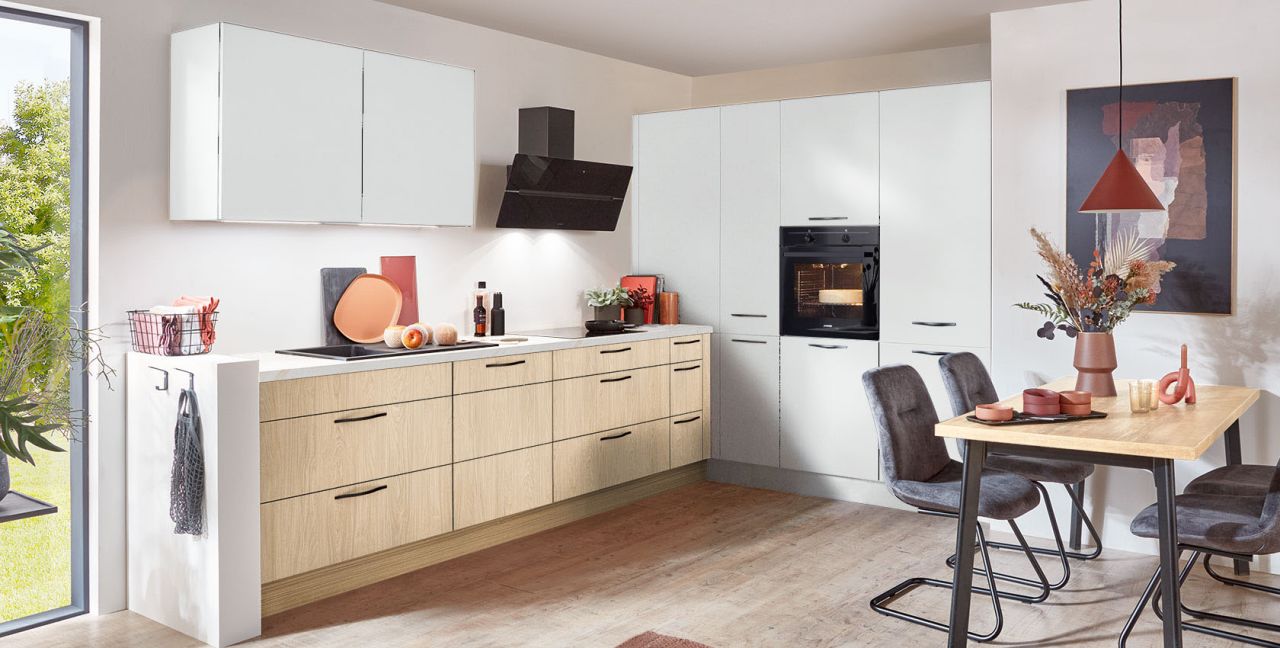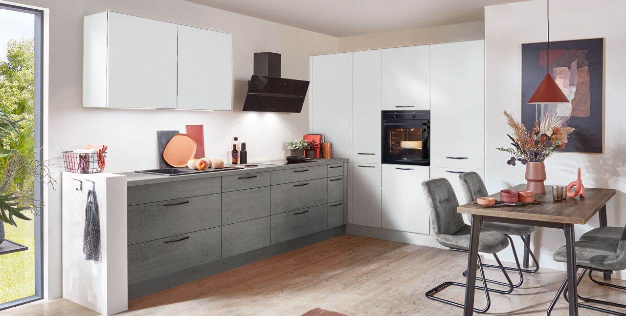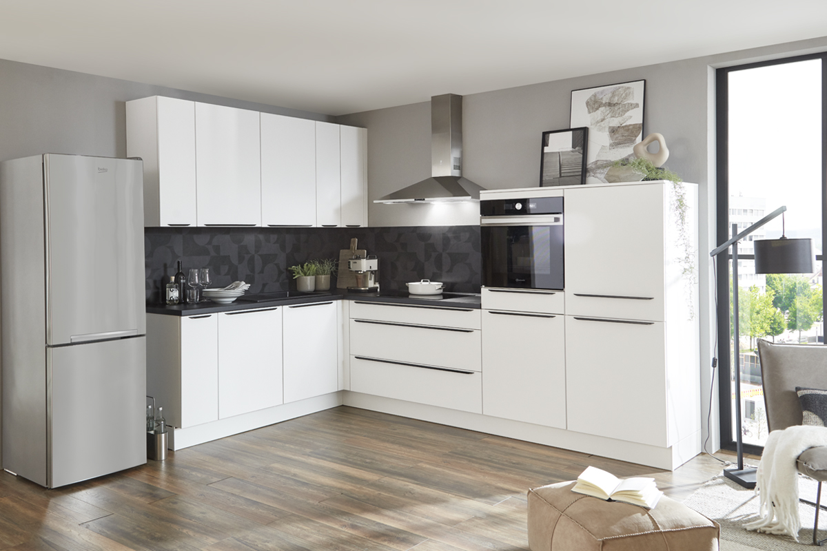 Inclusief inbouwoven zwart Junker JF1300061 Energieklasse A, keramische kookplaat Laurus LCA600, designschouw RVS / zwartglas Elica WISE90BK Energieklasse B, koelkast Laurus LKG88E Energieklasse E, volledig geïntegreerde vaatwasmachine Laurus LSV60-4 Energieklasse E, inbouw-designspoelbak Elleci Logik 300, onderkasten met frontladen.